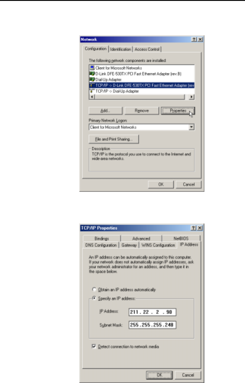 3. In the Network windows appears. Select the Configuration tab, select TCP/IP protocol line that has been associated