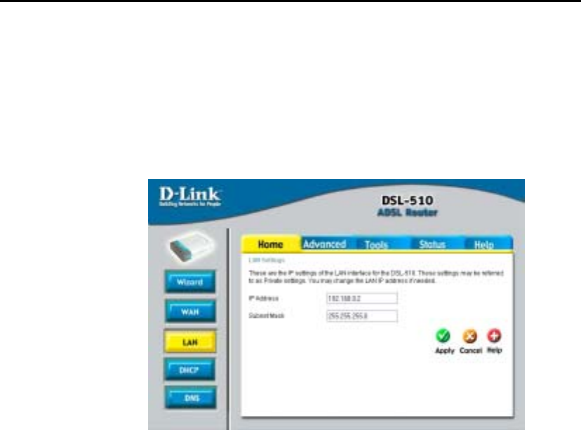 interface for the DSL-510. These settings may be referred to as Private settings. You may change the LAN IP address if
