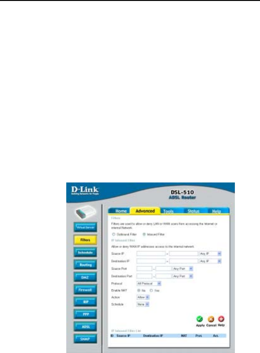Filters-Inbound: Use IP Inbound Filters to deny WAN IP addresses from accessing the internal network. You can deny