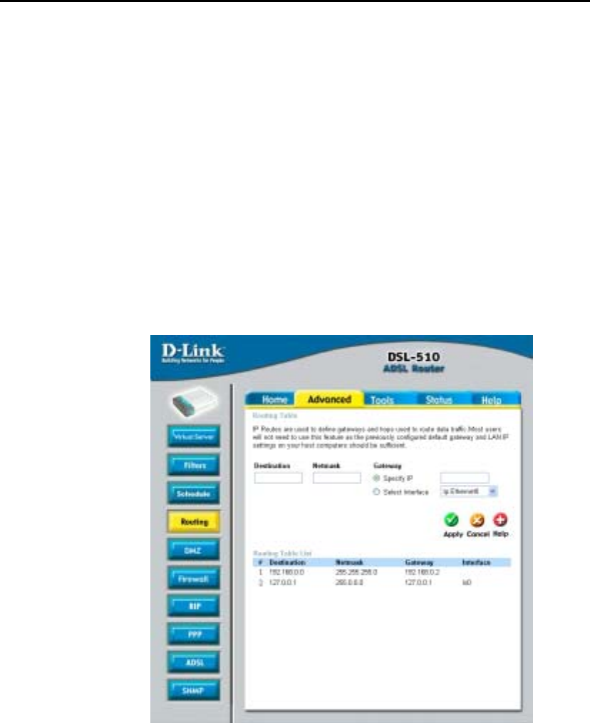 The Route Table page displays routing table and allows the user to manually enter the routing entry. The routing table will