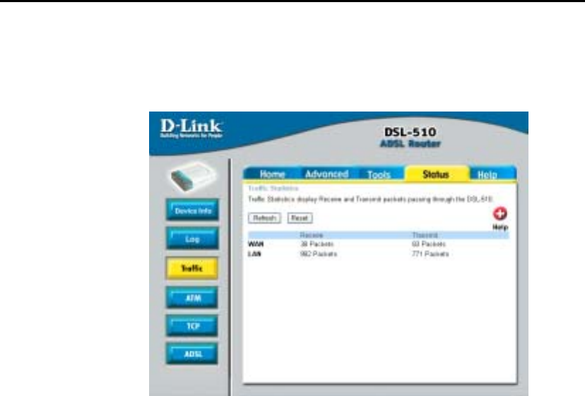 The ADSL Router keeps a statistic of traffic that passes through it. You are able to view the amount of packets that passes