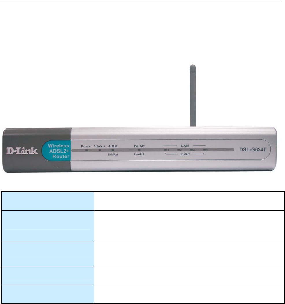 The LED indicators on the front panel include the Power, Status, ADSL and WLAN and Ethernet (1-4) Link/Act