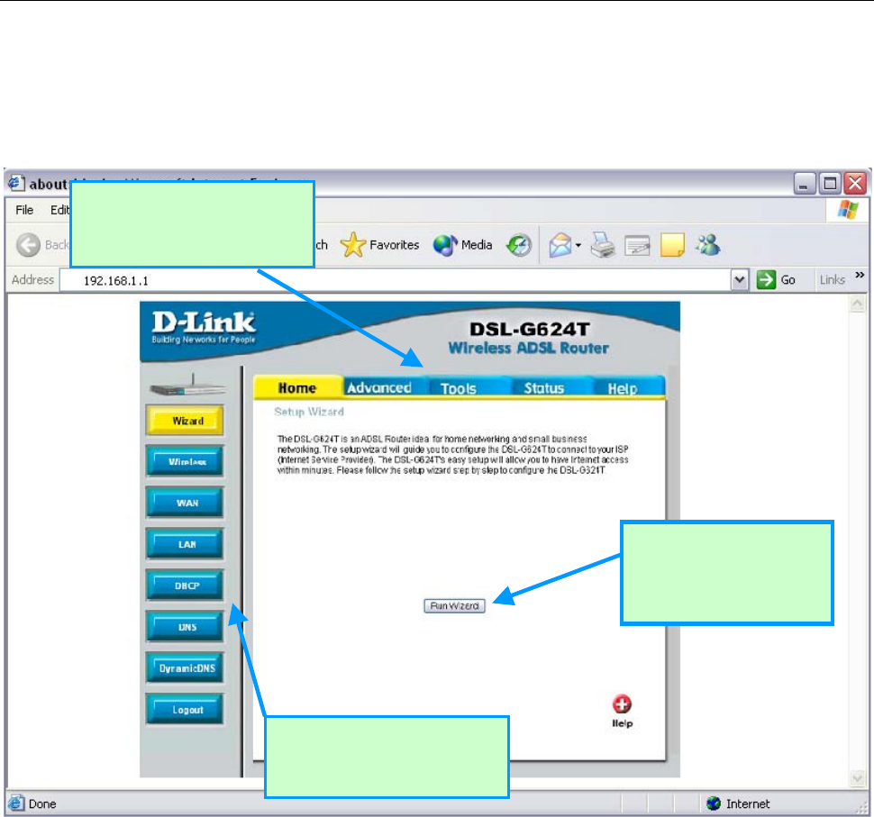 can launch the Setup Wizard from this page or use the menu buttons located in the left panel of the web page to view