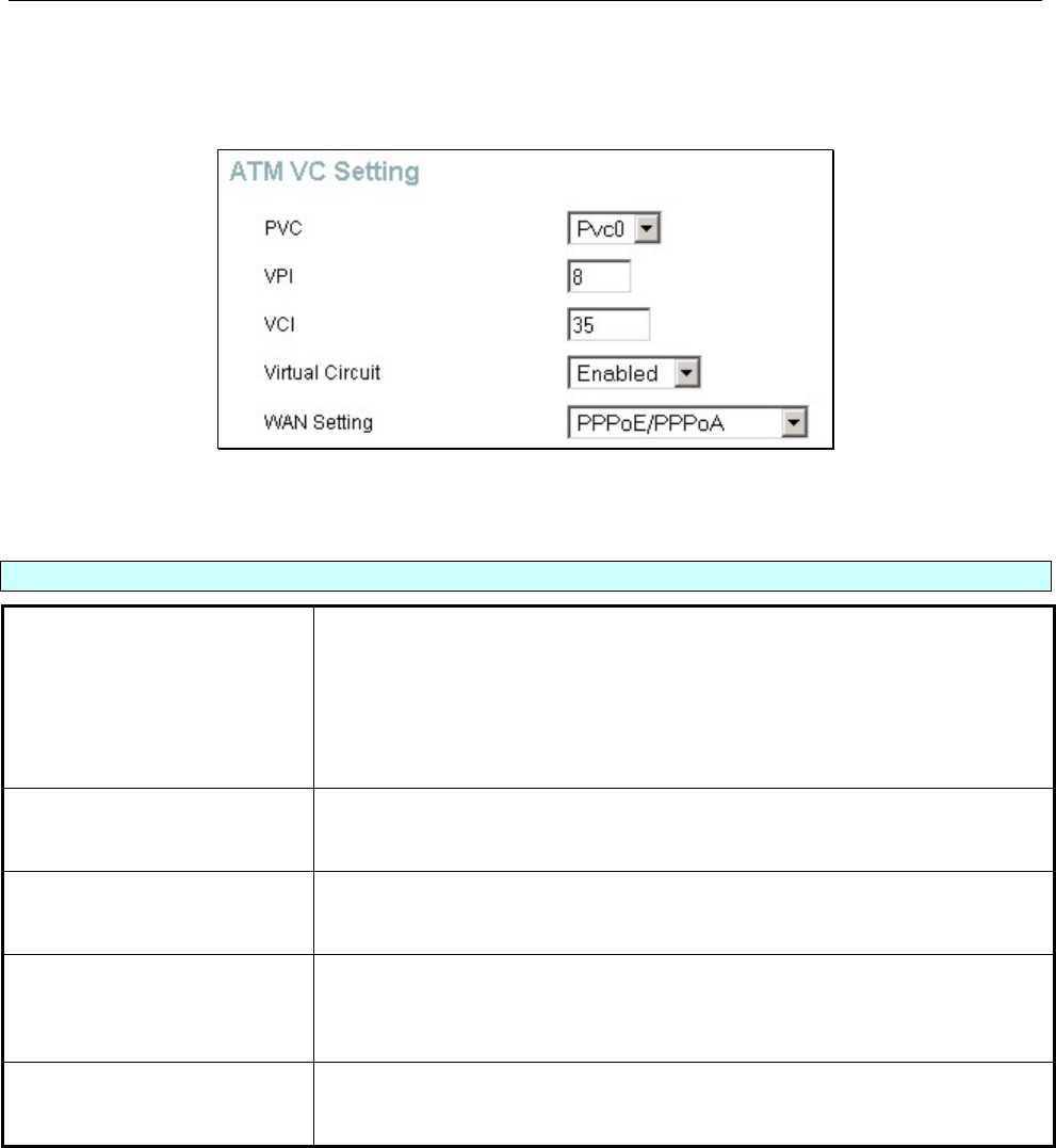 The table below describes the ATM VC settings used to configure a PPPoE or PPPoA connection for an ADSL account.