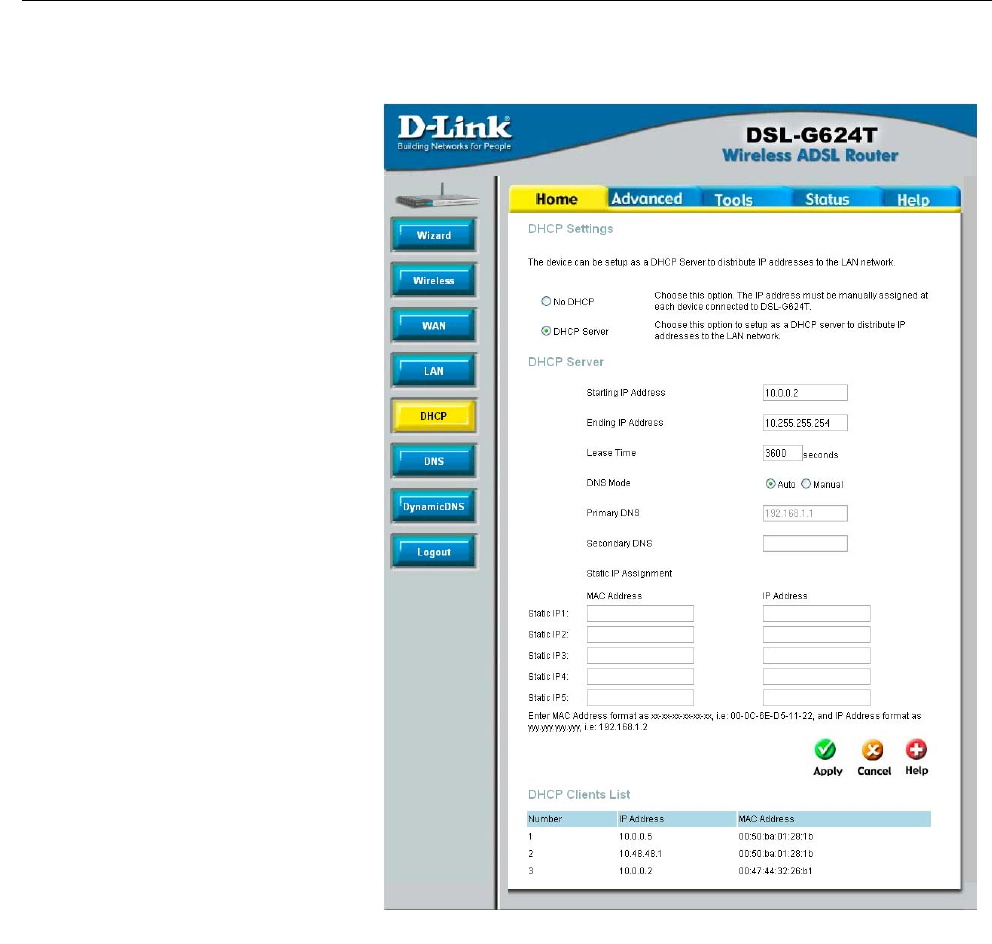 configured the DHCP Settings as you want them, click the Apply button to commit the new settings. The new settings