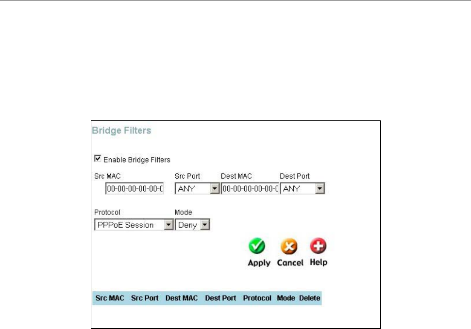 Bridge filters are used to block or allow various types of packets through the WAN interface. This may be done for