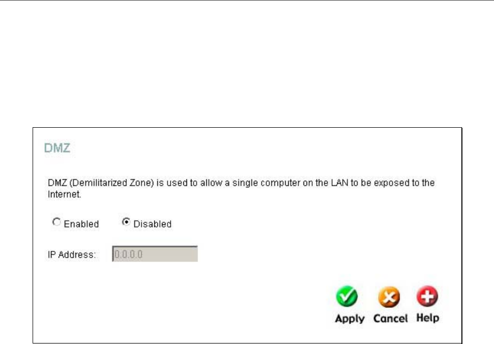 LAN, and click the Apply button. To remove DMZ status from the designated IP address, select the Disabled radio