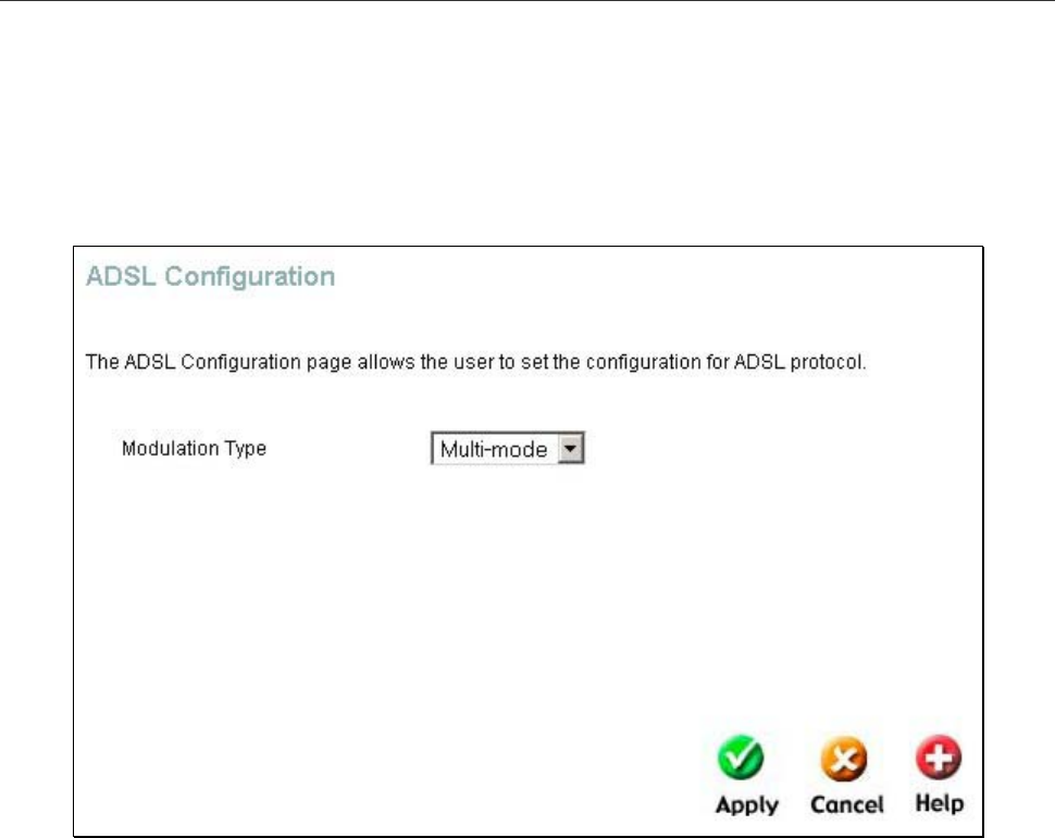 The ADSL Configuration page allows the user to set the configuration for ADSL protocols. For most ADSL accounts
