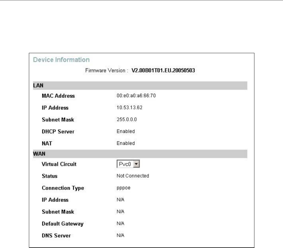 Use the Device Information window to quickly view basic current information about the LAN and WAN interfaces and