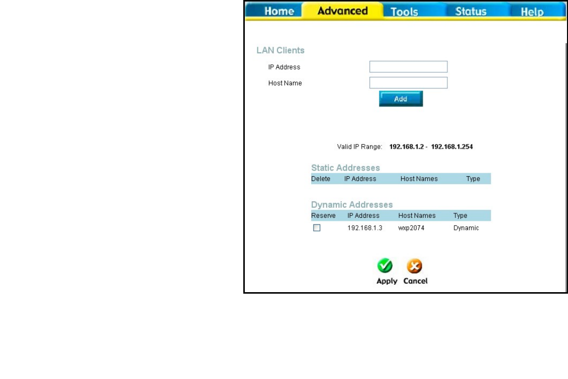 Use the LAN Clients menus to add or delete static IP addresses for the advanced