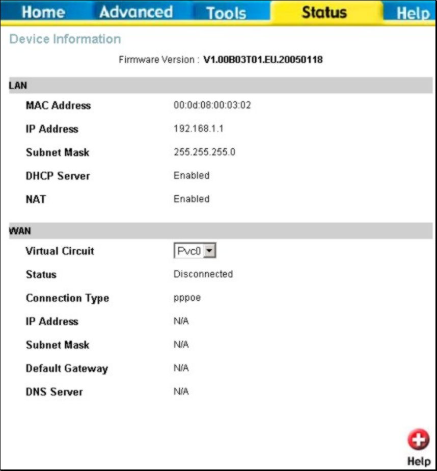 LAN and WAN interfaces and device information including Firmware Version and MAC