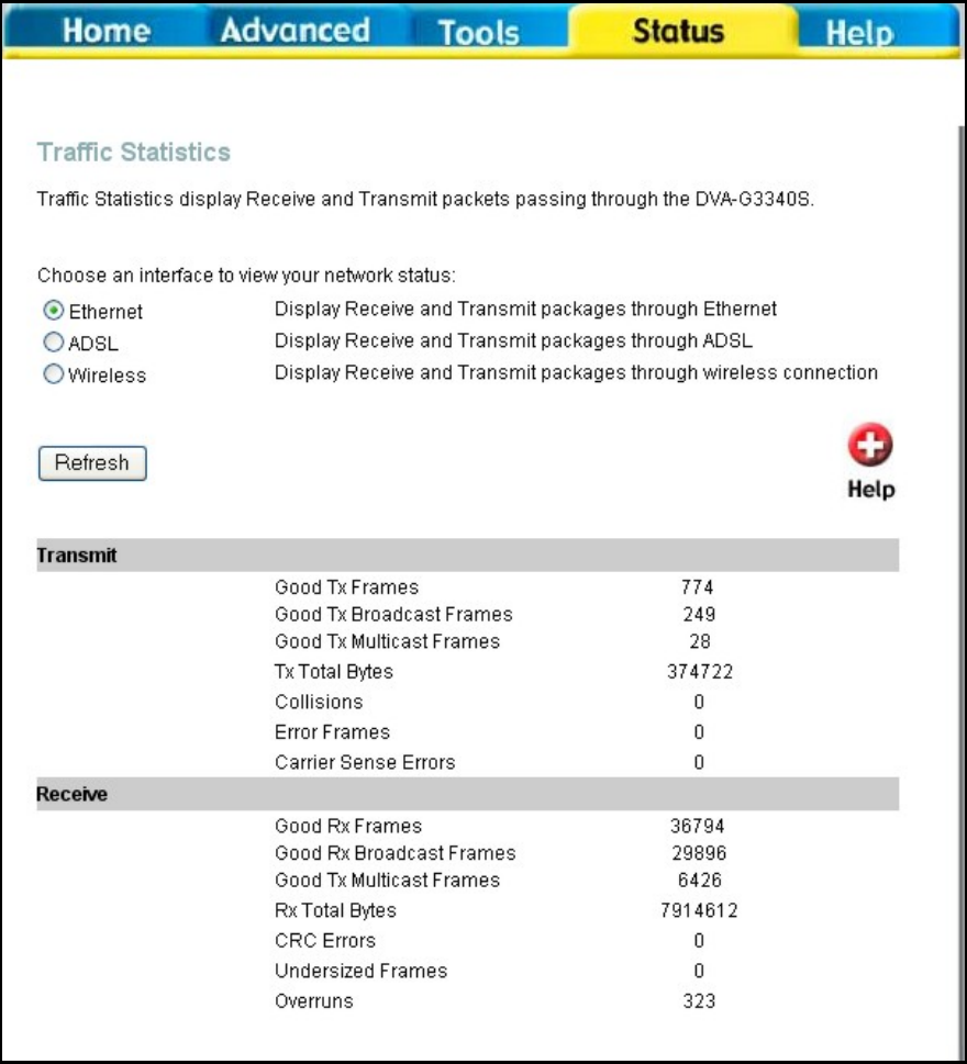 Use the Traffic Statistics window to monitor traffic on the Ethernet or ADSL Internet