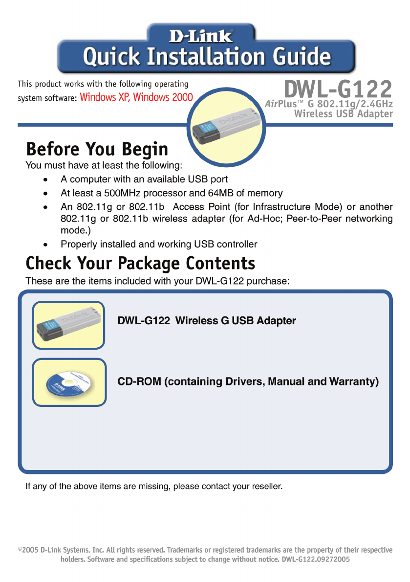 Installing the Drivers Turn on the computer and insert the D- Link AirPlus™ G DWL-G122 Driver CD in the CD-ROM drive. The step-by-step instructions that follow are shown in Windows XP. The steps and screens are similar for the other Windows operating systems. If the CD Autorun function does not automatically start on your computer, type “D:\Drivers\setup.exe.” If it does start, proceed to the next screen.