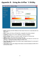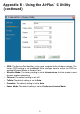 Appendix B - Using the AirPlus™ G Utility (continued) • SSID: The Service Set Identifier is the name assigned to the wireless network. The factory SSID setting is set to default. Make changes here to match the SSID on existing Wireless Router or Access Point. • Wireless Mode: The factory setting is set to Infrastructure. Ad-Hoc mode is used for peer-to-peer networking. • Channel: The default setting is set at 6. • TxRate:The default setting is set to Auto. • Preamble: The default setting is set to Auto.