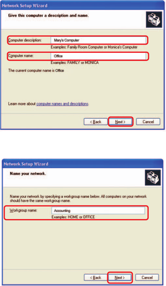Networking Basics (continued) Enter a Computer description and a Computer name (optional.) Click Next. Enter a Workgroup name. All computers on your network should have the same Workgroup name. Click Next.