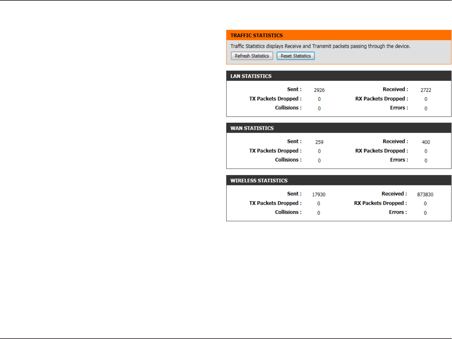In the Wireless Statistics section, the user can view the traffic statistics that