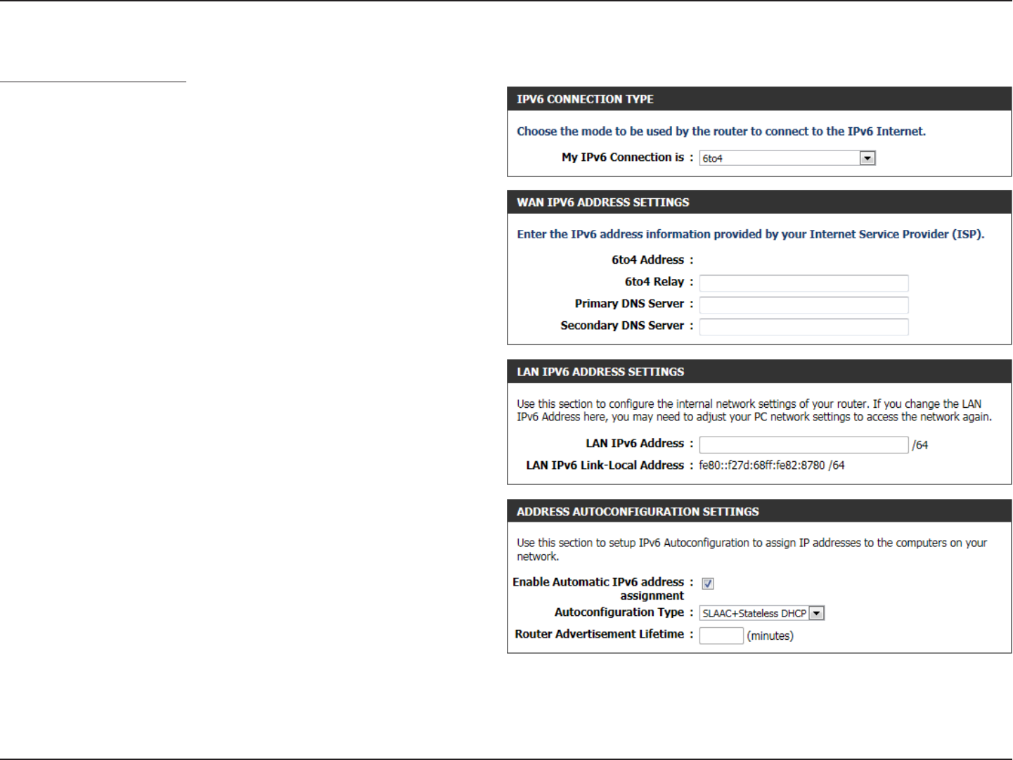 In this section the user can configure the IPv6 6to4 connection settings. 6to4 is an