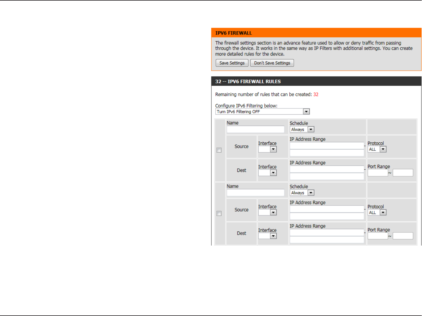 In the IPv6 Firewall Rules section the user can create, enable and disable IPv6