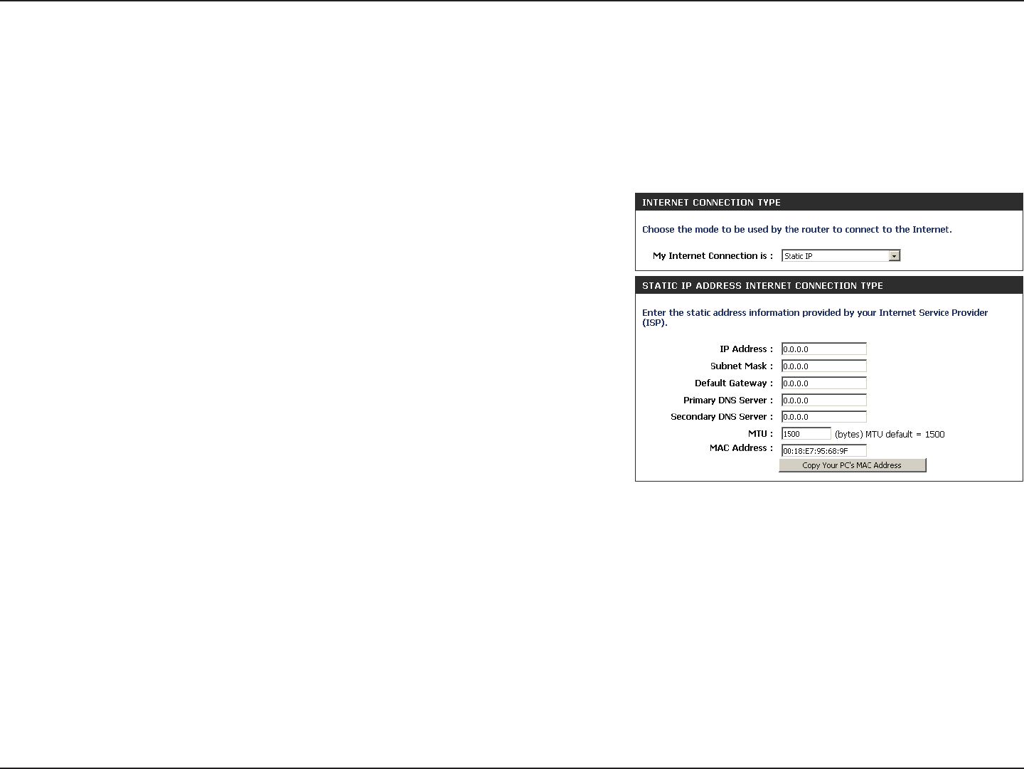 Select Static IP Address if all the Internet port’s IP information is provided to you by your ISP. You will need to enter in the IP address, subnet mask,