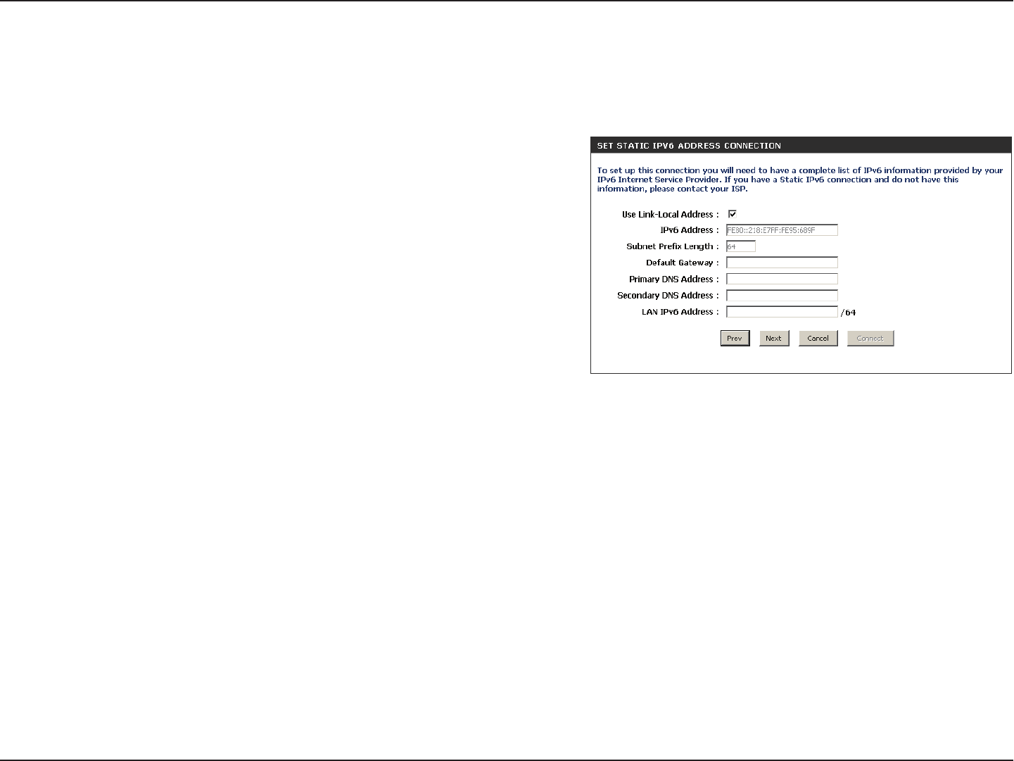 IPv6 conguration settings. You must enter the IPv6 address, Subnet Prex Length, Default Gateway, Primary DNS Server, and Secondary DNS