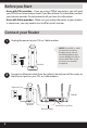 Before you Start • Users with DSL providers - If you are using a PPPoE connection, you will need your PPPoE user name and password. If you do not have this information, contact your Internet provider. Do not proceed until you have this information. • Users with Cable providers - Make sure you unplug the power to your modem. In some cases, you may need to turn it off for up to 5 minutes. Connect your Router 1 Unplug the power to your DSL or Cable modem.