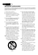 S A F E T Y IMPORTANT SAFEGUARDS PLEASE READ ALL THESE INSTRUCTIONS REGARDING YOUR TELEVISION EQUIPMENT AND RETAIN FOR FUTURE REFERENCE. FOLLOW ALL WARNINGS AND INSTRUCTIONS MARKED ON THE TV RECEIVER. 1 Read all of these instructions. 2 Save these instructions for later use. 3 Unplug this television equipment from the wall outlet before cleaning. Do not use liquid cleaners or aerosol cleaners. Use a damp cloth for cleaning.