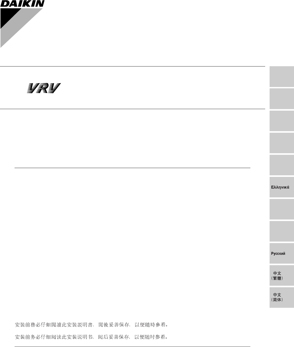 00_CV_3P086156-8X.fm Page 1 Tuesday, April 7, 2009 4:45 PM INSTALLATION MANUAL English SYSTEM Inverter Air Conditioners Deutsch MODELS Ceiling-mounted cassette type (corner model) FXKQ25MVE FXKQ32MVE FXKQ40MVE FXKQ63MVE FXKQ25MAVE FXKQ32MAVE FXKQ40MAVE FXKQ63MAVE Français Español Italiano READ THESE INSTRUCTIONS CAREFULLY BEFORE INSTALLATION. KEEP THIS MANUAL IN A HANDY PLACE FOR FUTURE REFERENCE. LESEN SIE DIESE ANWEISUNGEN VOR DER INSTALLATION SORGFÄLTIG DURCH.