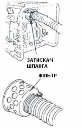 Прилаштуйте сито, що входить до комплекту постачання мотопомпи, до іншого кінця