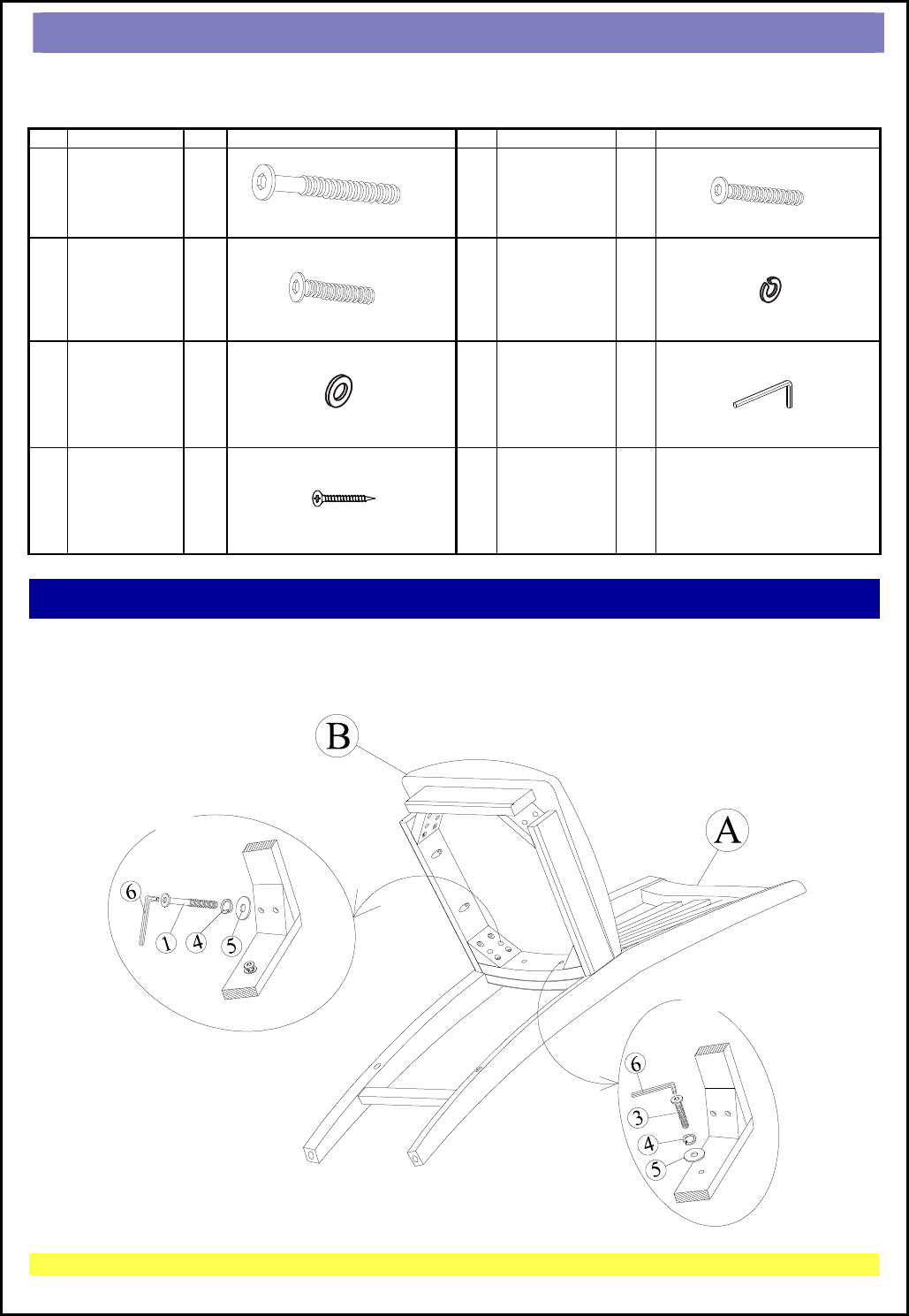 Attach frame (B) to the back (A) by using bolts (3) and (1) and washers (4) and (5). Tighten with Allen