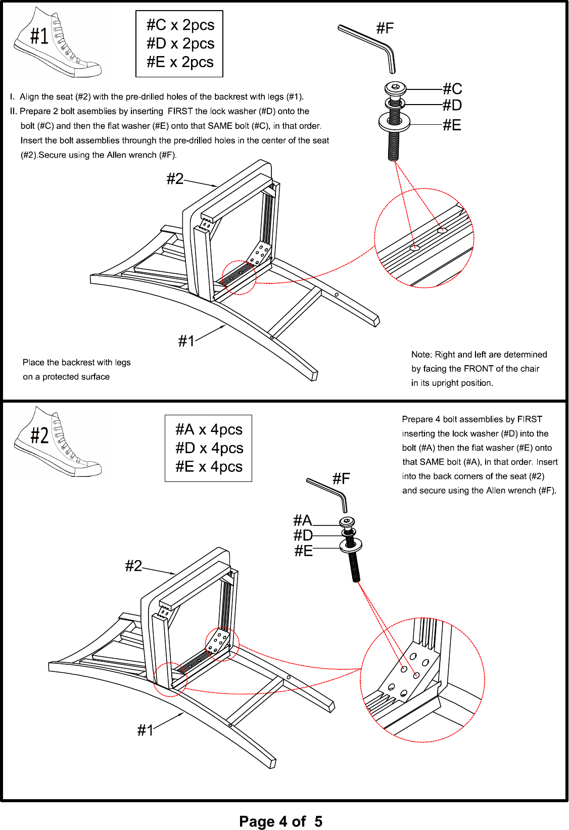 II. Align the seat (#2) to the pre-drilled holes on the backrest with legs (#1).