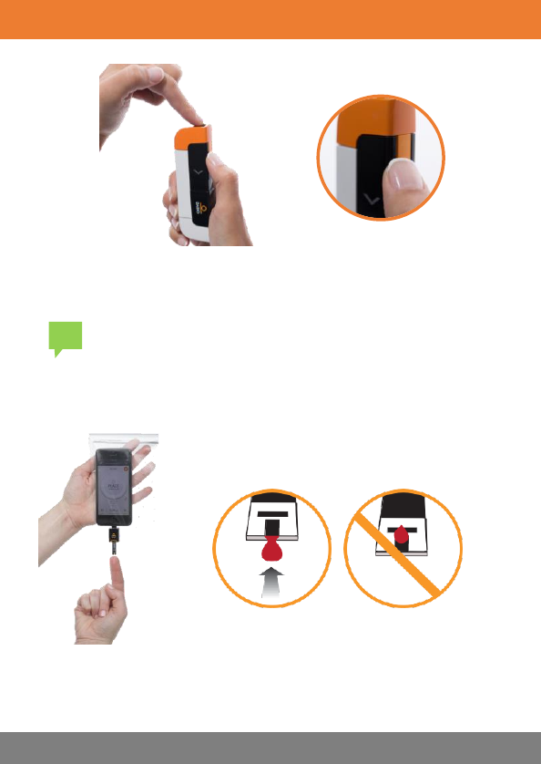 3. Apply a drop of blood to the tip of the yellow window of the test strip, as
