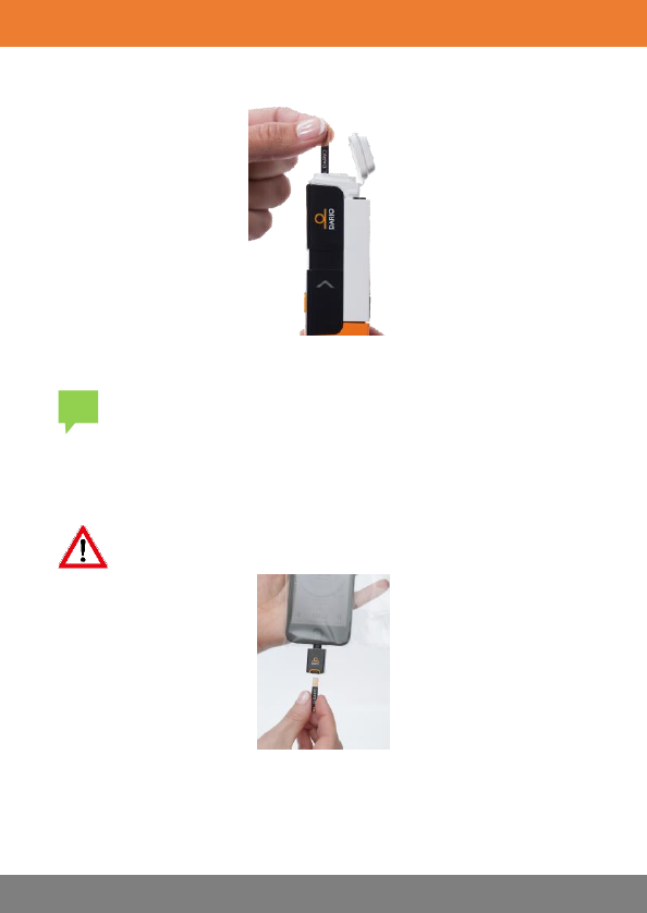 7. Without bending the strip, insert it into the test strip port of the Dario LC