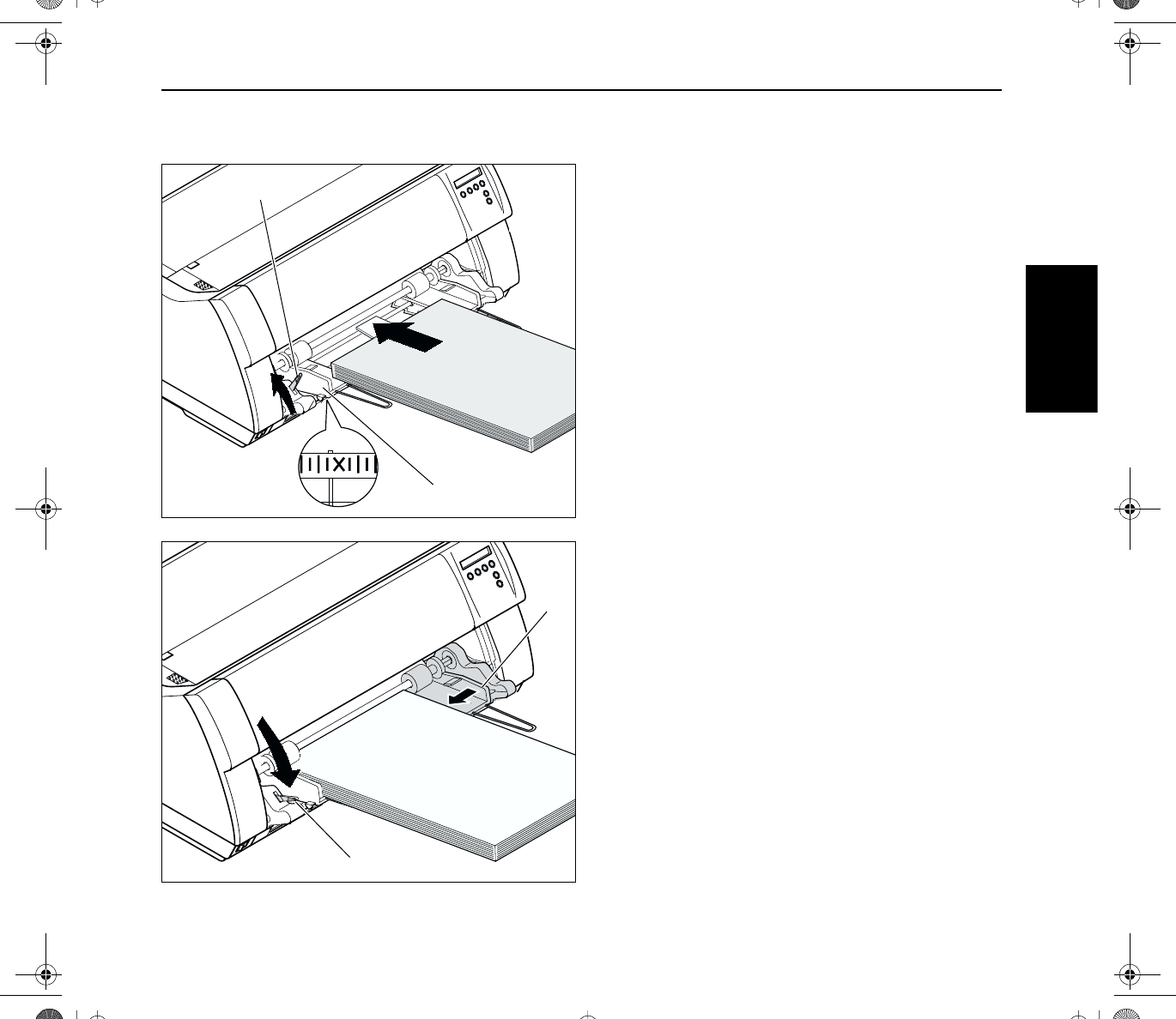 Die linke Papierführung ➀ an der Markierung auf der un-
