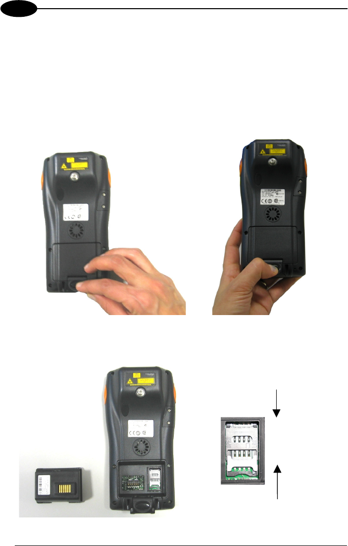2- Press the latch release button and pull the battery latch down as indicated in the