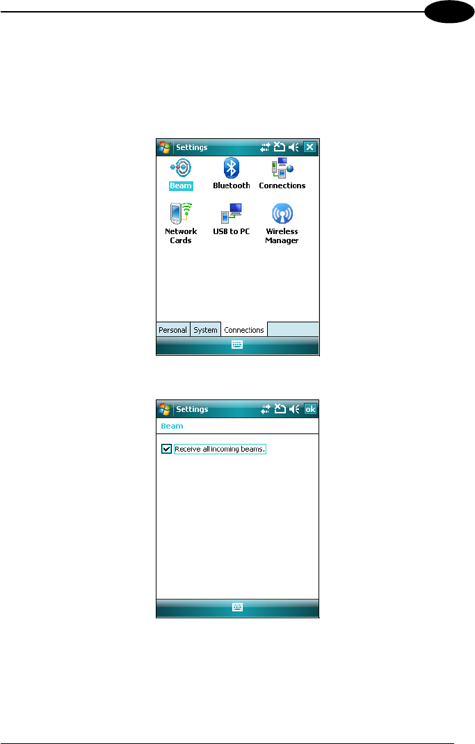 1. Tap Start -> Settings -> Connections tab -> Beam: