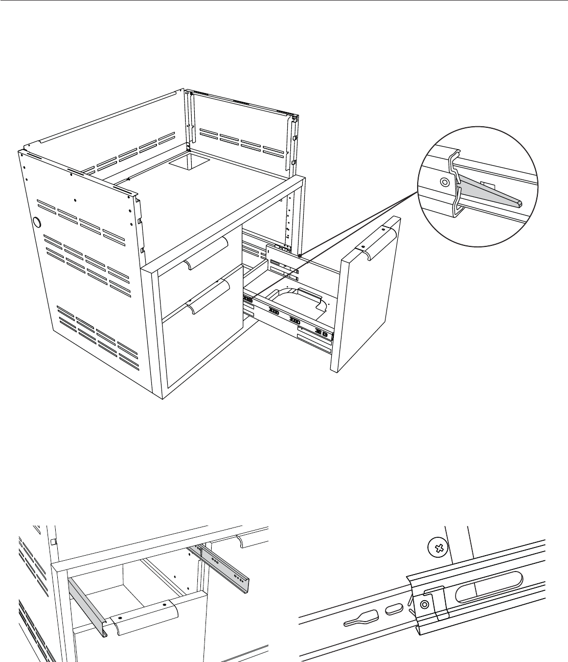 1 To remove the drawers, pull them out until their slider latch is visible. Carefully push the latch down