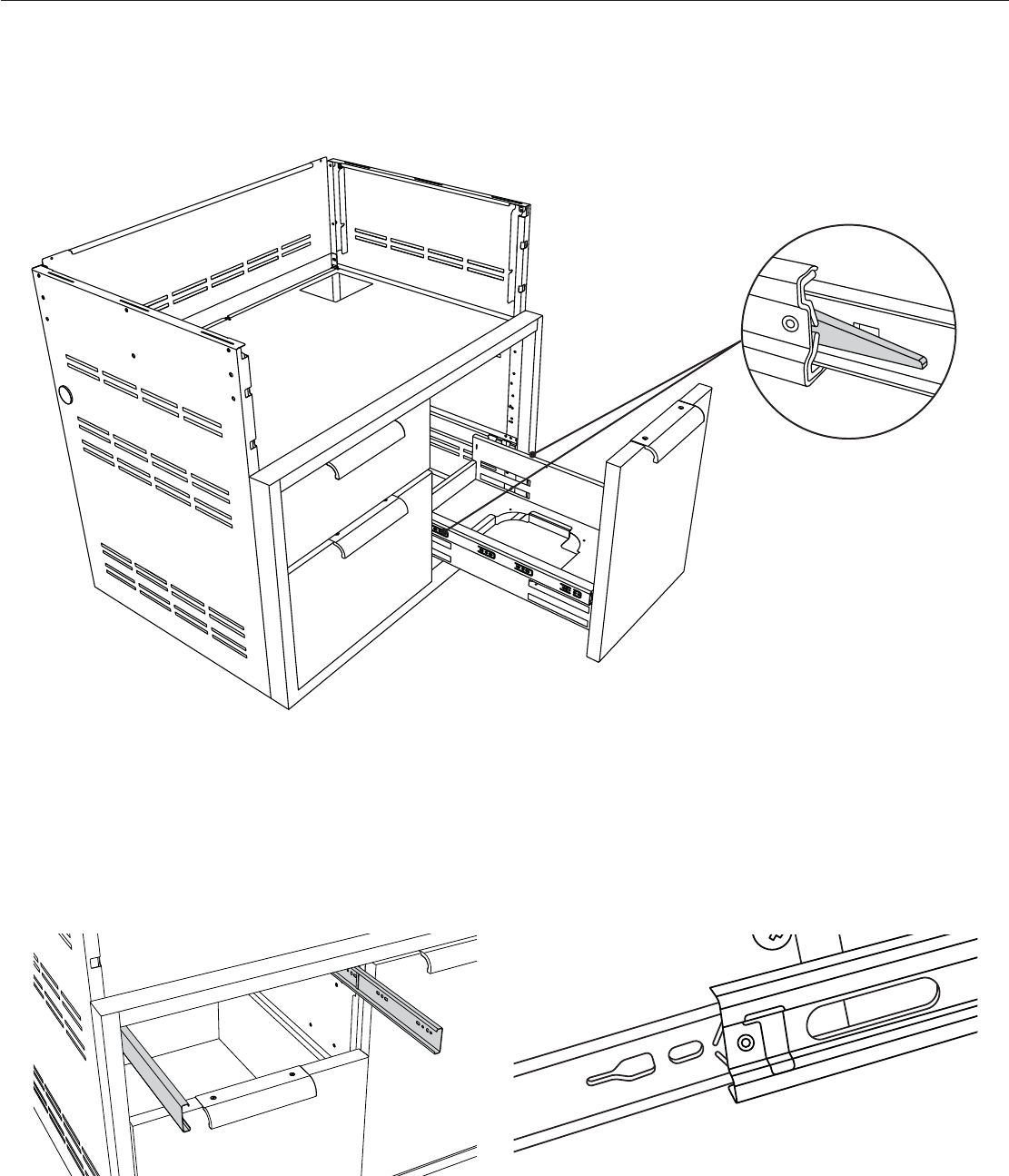 1 Remonter les tiroirs en étendant leurs guides. 2 Tout en maintenant le tiroir parallèle à l’élément,
