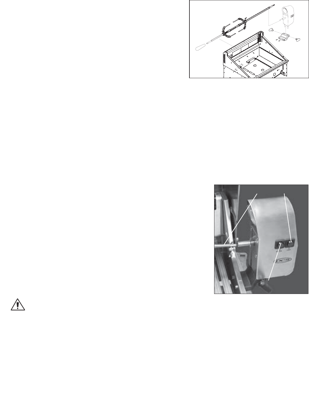 posant l’extrémité du manche sur le support, sur le côté gauche du gril. Le tournebroche étant enfoncé le plus