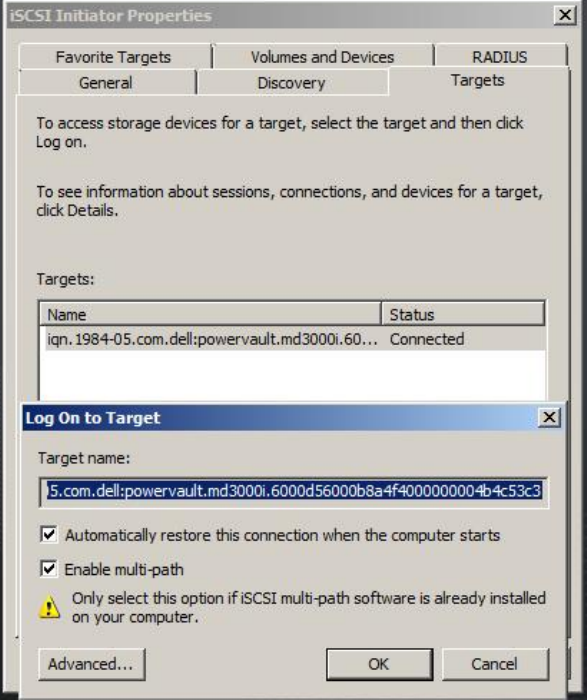 5.  If the virtual disk requires CHAP credentials, click Advanced in the Log On to Target dialog