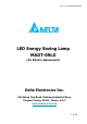 Doc. No. 121-MR0901002-EN00 CONTENT 1. OUTLOOK 2. APPLICATION 3. FEATURES 4. OPERATION CONDITION 5. SPECIFICATION 6. PHOTOMETRY 7. ILLUMINANCE 8. PRODUCT CODE DEFINITION 9. INSTALLATION 10. WARNING 11. WARRANTEE 12. ENVIRONMENTAL BENEFIT 13. ECONOMIC BENEFIT Delta Electronics Inc. 252 Shang Ying Road, Guishang Industrial Zone, Taoyuan County, 33341, Taiwan, R.O.