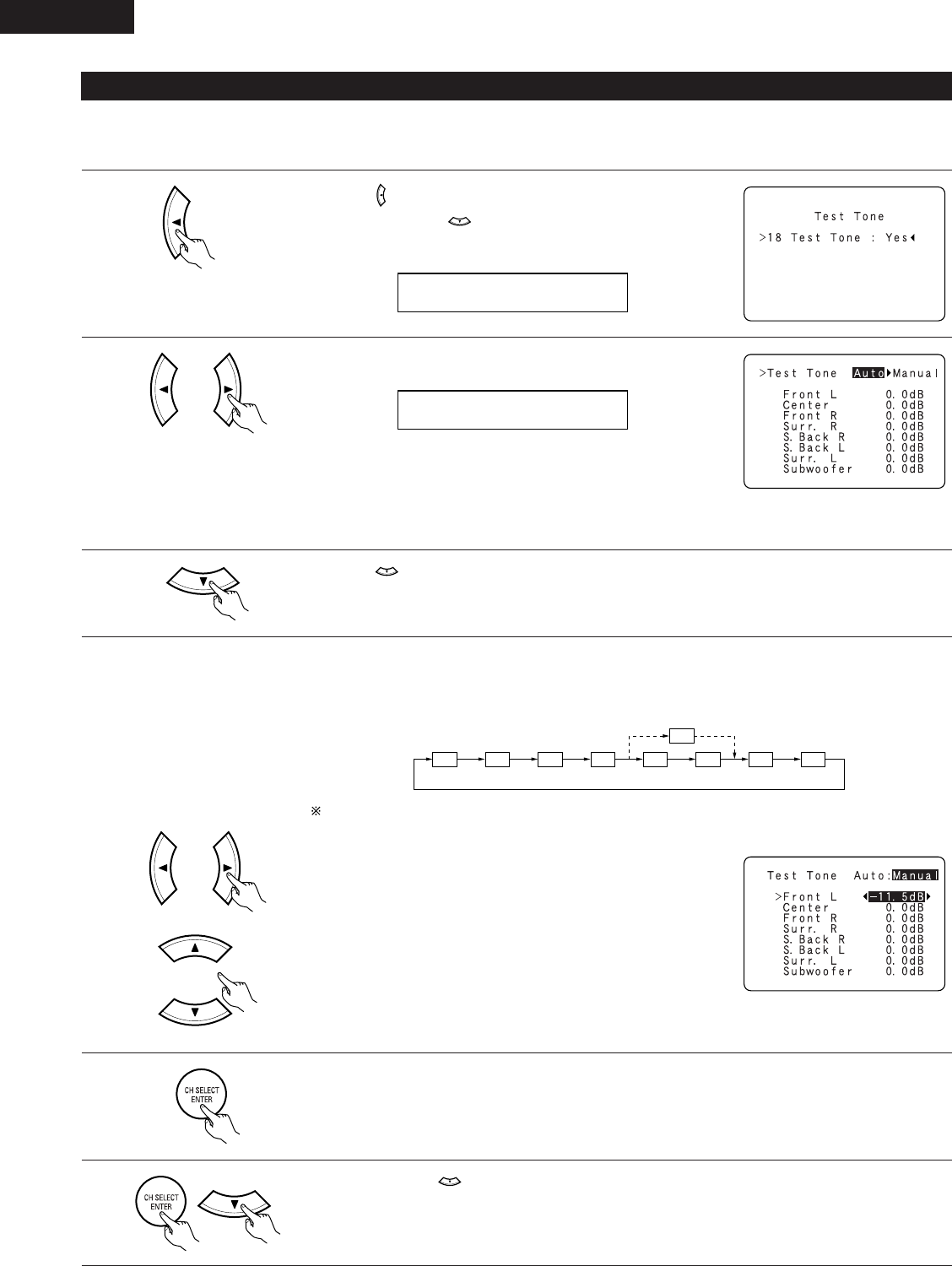 •From the listening position, listen to the test tones produced from the speakers to adjust the level.