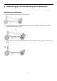 3 Udfoldning og sammenfoldning af el-løbehjulet Udfoldning af el-løbehjulet 1) Placér el-løbehjulet på hjulene, som vist herunder. 2) Lad højre hånd trykke let ned på bagskærmen, mens venstre hånd løfter den lange stang opad, indtil foldebeslaget slipper krogen. 3) Løft den forreste stang, og træk foldebeslaget op mod den lodrette stang, og lås det ved at klemme på det.