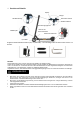1. Produkt und Zubehör Display Klingel LED-Beleuchtung Elektrische Bremse Weißer Reflektor Beschleunigungstaste Taste für das Zusammenfalten Stoßdämpfer Mechanische Bremse Rücklicht 6,5"-Räder Eingebaute wiederaufladbare Batterie (25,2 V~/4000 mAh) – Das vollständige Laden des Elektrorollers dauert ca. 3 Stunden. WICHTIG: Dieser Elektroroller muss an einem sicheren Platz geladen und gelagert werden.