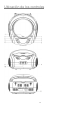 1. ABRIR/CERRAR 2. ENCENDIDO/DIVERSIÓN ⚫ Modo en espera: Púlselo brevemente para encender la radio; manténgalo pulsado para apagar la radio. De forma predeterminada la radio se enciende en modo DAB. ⚫ Modo de funcionamiento: Púlselo brevemente para moverse por los modos DAB/FM/CD/USB/AUX. 3. ANTERIOR/SIGUIENTE ⚫ En modo FM: Púlselo brevemente para buscar hacia arriba o hacia abajo por las frecuencias de radio. Manténgalo pulsado para buscar hacia arriba o hacia abajo por las frecuencias de FM.