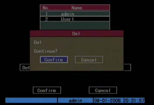 2. Click Del to delete that user. A confirmation dialog displays as shown below.