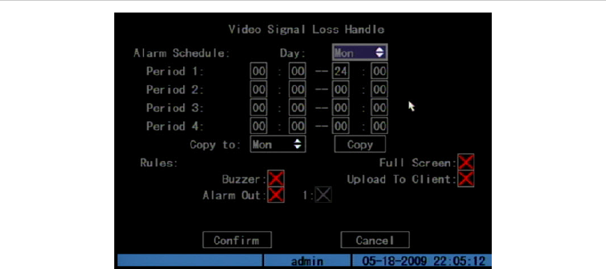 The system’s handling of a video loss alarm depends on the alarm schedule. In