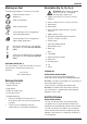 中文(简体) 速度及冲击性能电子控制盘的设 定(图1、3) 操作 使用须知 D25601、D25602、D25603 警告:请始终遵守安全指示及相关条 把盘(g)旋转至所需档位。向上转速度加快,向 例。 下转速度降低。如何设定要靠经验。例如: 警告:为降低伤害风险,在安装或拆卸 - 在软、脆材料上錾平作业,或要求尽可 配件、附件,或进行调整前,请关闭工 能避免破裂时,把盘设定到低速。 具并断开与电源的连接。 - 在较硬材料上破拆或钻孔作业时,把盘 警告:钻头可能很烫,在更换或拆卸时 设定到高速。 应佩戴手套,以避免人身伤害。 扭矩控制开关的设定(图3) D25602、D25603 注意:改变扭矩控制的设定前,务必关 警告: • 注意管道和电线的位置。 • 仅对工具轻柔用力(大约20千克)。用 闭工具,否则会损坏工具。 力过度不仅不能提高钻孔速度,而且会 根据需要,把扭矩控制杆(t)移动到40牛顿米或 80牛顿米。 降低工具性能、缩短工具寿命。 • 40牛顿米(u)的离合器设定适合大部 始终双手握紧工具,确保姿势安稳。每 次操作工具前,应确保侧手柄妥善装