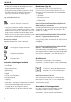 ENGLISH • Press the spindle lock (2) and rotate the spindle (11) until it locks in position. • Tighten the flange (14) with the two-pin spanner supplied. • Release the spindle lock. • To remove the disc, loosen the flange (14) with the two-pin spanner. Do not use a damaged disc. Mounting the side handle (fig. D) • Screw the side handle (4) tightly into one of the holes (14) on either side of the gear case. Instructions for use • Always observe the safety instructions and applicable regulations.