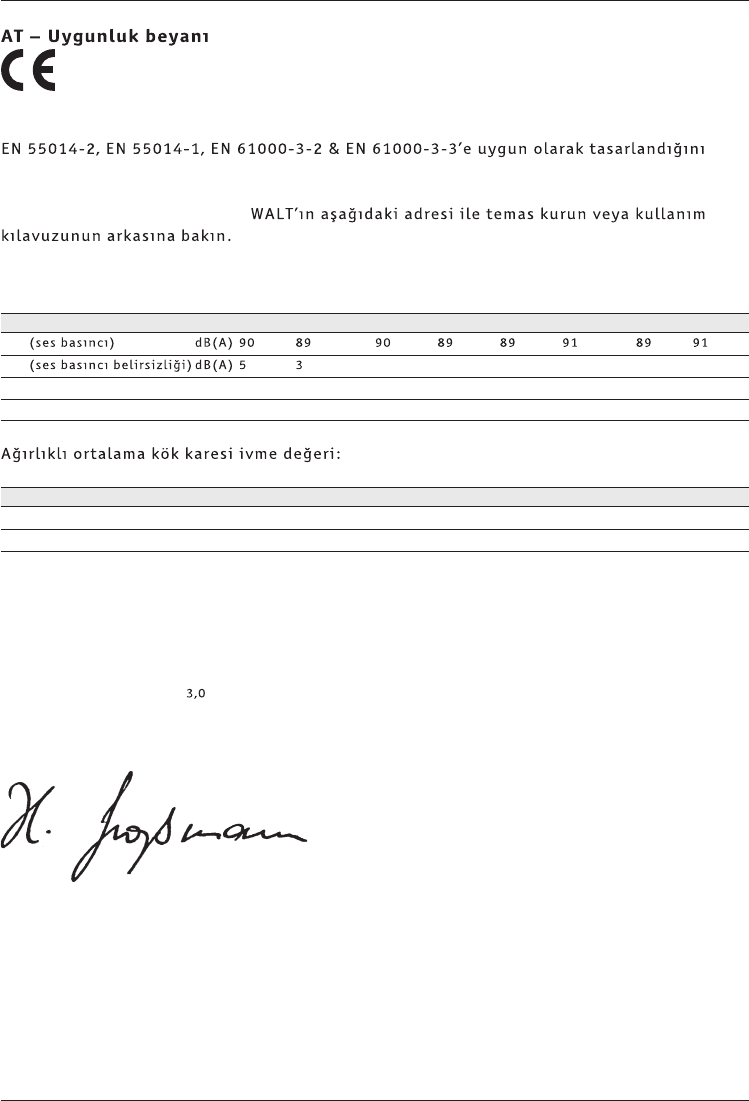 WALT, bu elektrikli aletlerin 98/37/EC, 89/336/EEC, 73/23/EEC, 86/188/EEC, EN 50144,