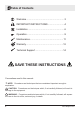 Table of Contents Welcome.............................................................3 IMPORTANT INSTRUCTIONS........................... 4 Installation..........................................................6 Operation............................................................9 Maintenance..................................................... 11 Warranty...........................................................12 Technical Support.............................................